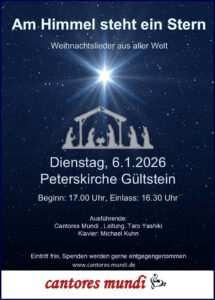Konzert am 06.01.2026, 17 Uhr in der ev. Peterskirche in Herrenberg-Gültstein mit Weihnachtsliedern aus aller Welt.